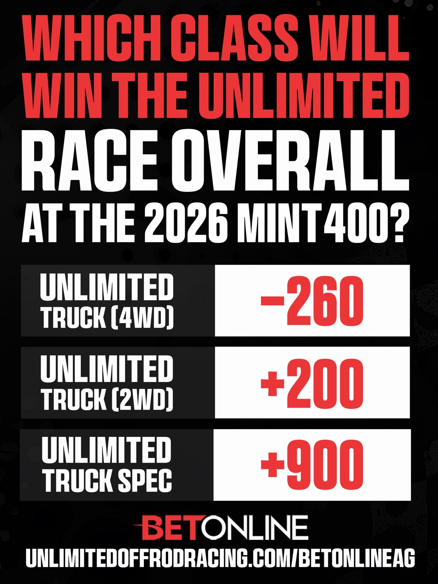 “We’re excited to welcome BetOnline back to The Mint 400,” said Matt Martelli, CEO of Unlimited Off-Road Racing. “Betting has always been part of off-road racing—racers have long had side bets and pools—but now we have a fantastic partner that allows fans to wager on their favorite drivers in a safe, official way.” Fans can place bets on a wide range of outcomes, from the Overall Mint 400 winner to which class or manufacturer will claim top honors, and even whether notable drivers like Jimmie Johnson will finish in the top five. With defending champion Adam Housholder facing strong competition from former Mint 400 champions Robby Gordon, Eric Hardin, and Kyle Jergensen, the betting lines promise to make this year’s event as thrilling off the track as it is on it.